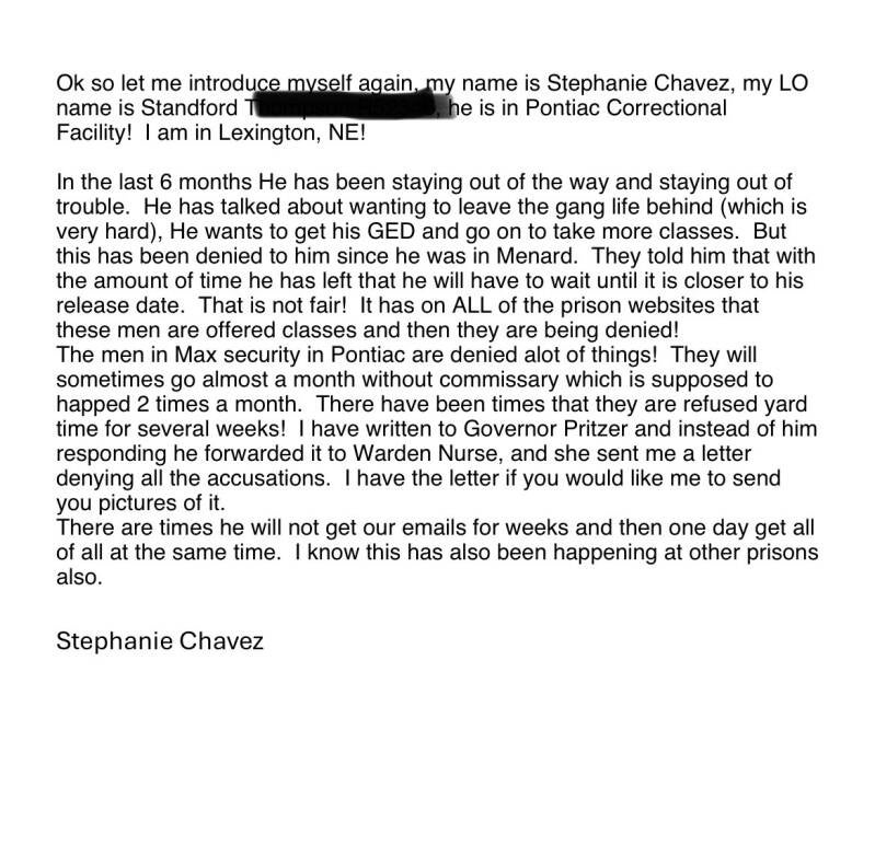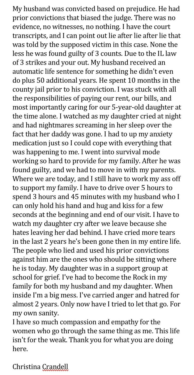 Join us in our mission to reform Illinois laws, hold the justice system accountable, and support incarcerated individuals and their families. Explore the various letters sent in to have a deeper understanding of what families have to go through.